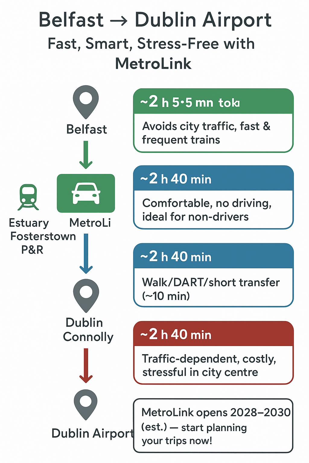 • By offering a faster, more reliable alternative to car travel, especially along busy corridors (e.g. Swords-Airport-City Centre).
