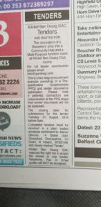 Advertisement printed in local newspaper today Monday 23rd July 2018 inviting contractors to express an interest in tendering for proposed works at Kilclief GAC, Shore Road, Strangford, Co.Down. Works involve creating community hub facility within undercroft of existing club building and associated works. Below image published in the Irish News on Monday 23rd July 2018. […]
