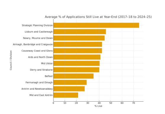 In contrast, rural councils (Mid Ulster, Fermanagh & Omagh, Mid & East Antrim) show fewer live cases and faster throughput, reflecting simpler applications (mainly single dwellings or agricultural sheds).
