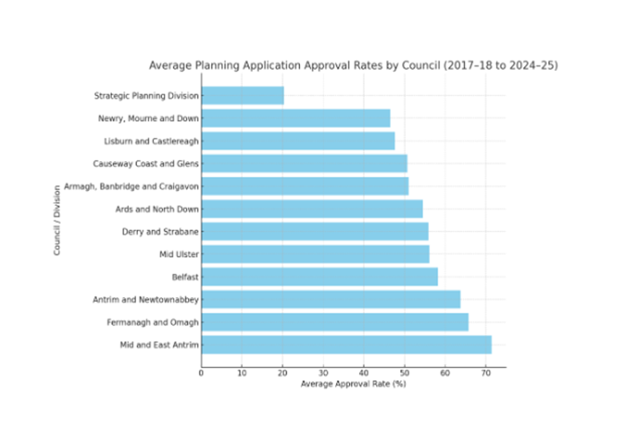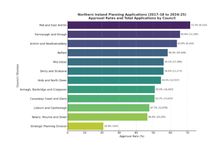 - Top performers such as Mid and East Antrim (71.5%), Fermanagh and Omagh (65.6%), and Antrim and Newtownabbey (63.8%) maintain strong approval consistency — reflecting a rural profile and fewer large-scale refusals.