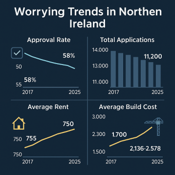 The most significant and worrying trend emerging from the Northern Ireland planning statistics (2017–18 → 2024–25) is the steady decline in overall planning application volumes, particularly within urban councils, coupled with a widening approval-rate gap between rural and urban authorities. Compare these trends with average rents £ and building costs £/m2 and problems becoming obvious.